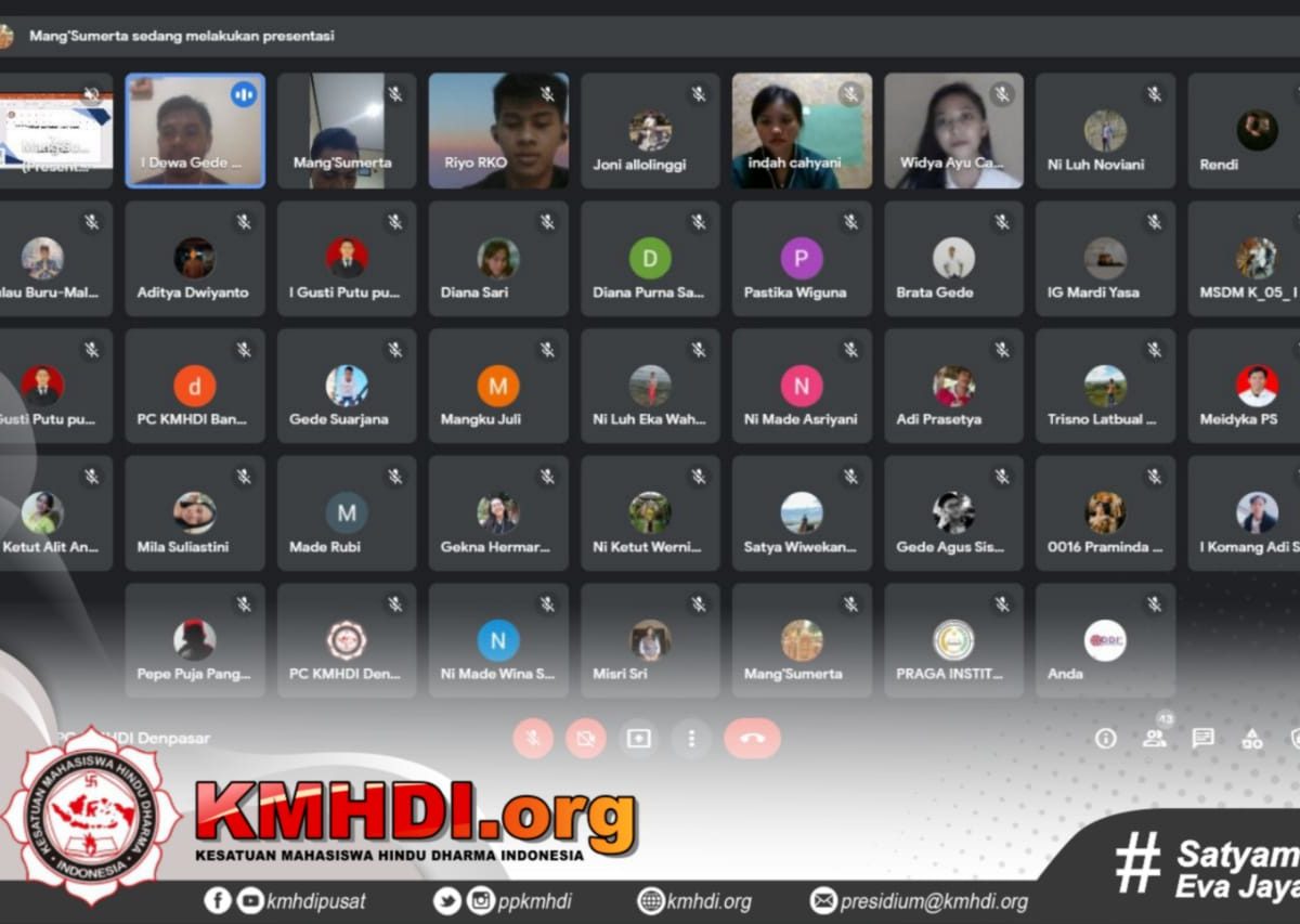Denpasar, kmhdi.org – Pimpinan Cabang Kesatuan Mahasiswa Hindu Dharma Indonesia (PC KMHDI) Denpasar kembali melaksanakan kegiatan e-Ngopi (elektronik – Ngobrol Pintar) dengan tema “Persatuan dalam Keragaman: PC KMHDI Denpasar Menyapa Mahasiswa Hindu Nusantara” yang dilaksanakan secara daring melalui Google Meet pada Kamis (30/9).