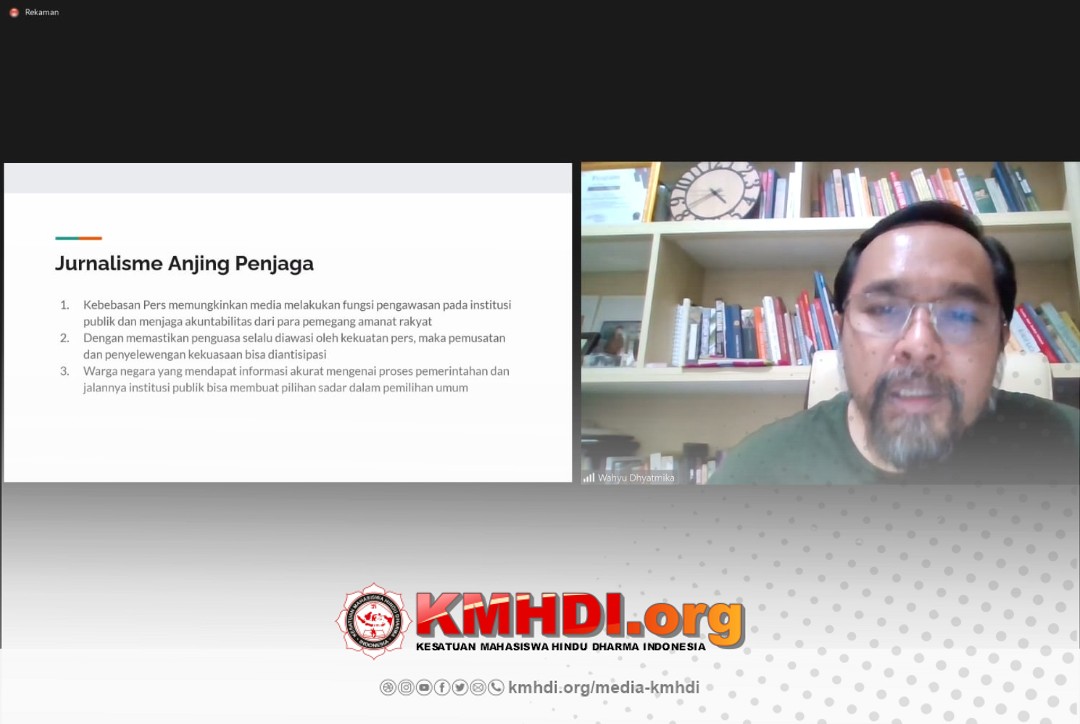 “Jurnalisme sebagai anjing penjaga diibaratkan sebagai kebebasan pers yang memungkinkan media melakukan fungsi pengawasan dan menjaga akuntibilitas dari para memegang amanat rakyat. Selain itu, KMHDI sebagai organisasi mahasiswa yang berskala nasional juga harus bisa memastikan penguasa negeri selalu diawasi oleh kekuatan pers sehingga pemusatan dan penyelewengan kekuasaan bisa diantisipasi sejak dini” Jelas Bli Wahyu Dhyatmika.