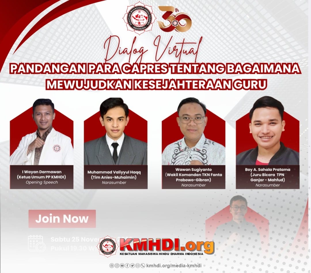 Jakarta, kmhdi.org – Pengurus Pusat Kesatuan Mahasiswa Hindu Dharma Indonesia (PP KMHDI) menggelar diskusi virtual bertajuk “Pandangan Capres tentang Bagaimana Cara Mensejahterakan Guru”, Sabtu kemarin. Diskusi ini bertujuan sebagai media pencerdasan untuk melihat dan mengukur program-program pasangan para capres yang berkaitan dengan upaya mensejahterakan guru.(25/11)