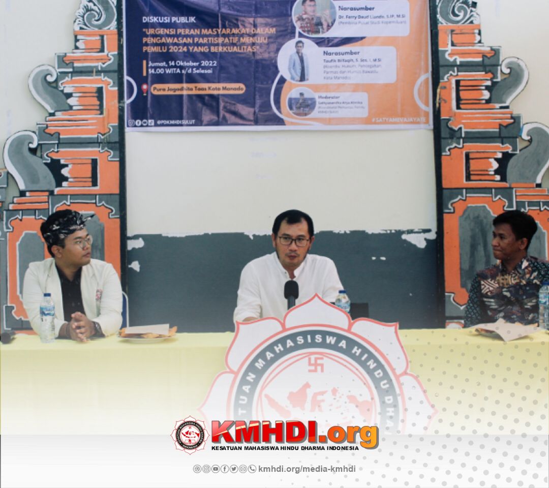 Manado, Kmhdi.org-Pimpinan Daerah Kesatuan Mahasiswa Hindu Dharma Indonesia Sulawesi Utara (PD KMHDI Sulut) Gelar Diskusi Publik dengan mengusung tema “Urgensi Peran Masyarakat Dalam Pengawasan Partisipasif Menuju Pemilu 2024 yang Berkualitas”. Kegiatan ini dilaksanakan di Pura Jagadhita Taas, Manado, Jumat, (14/10/2022)