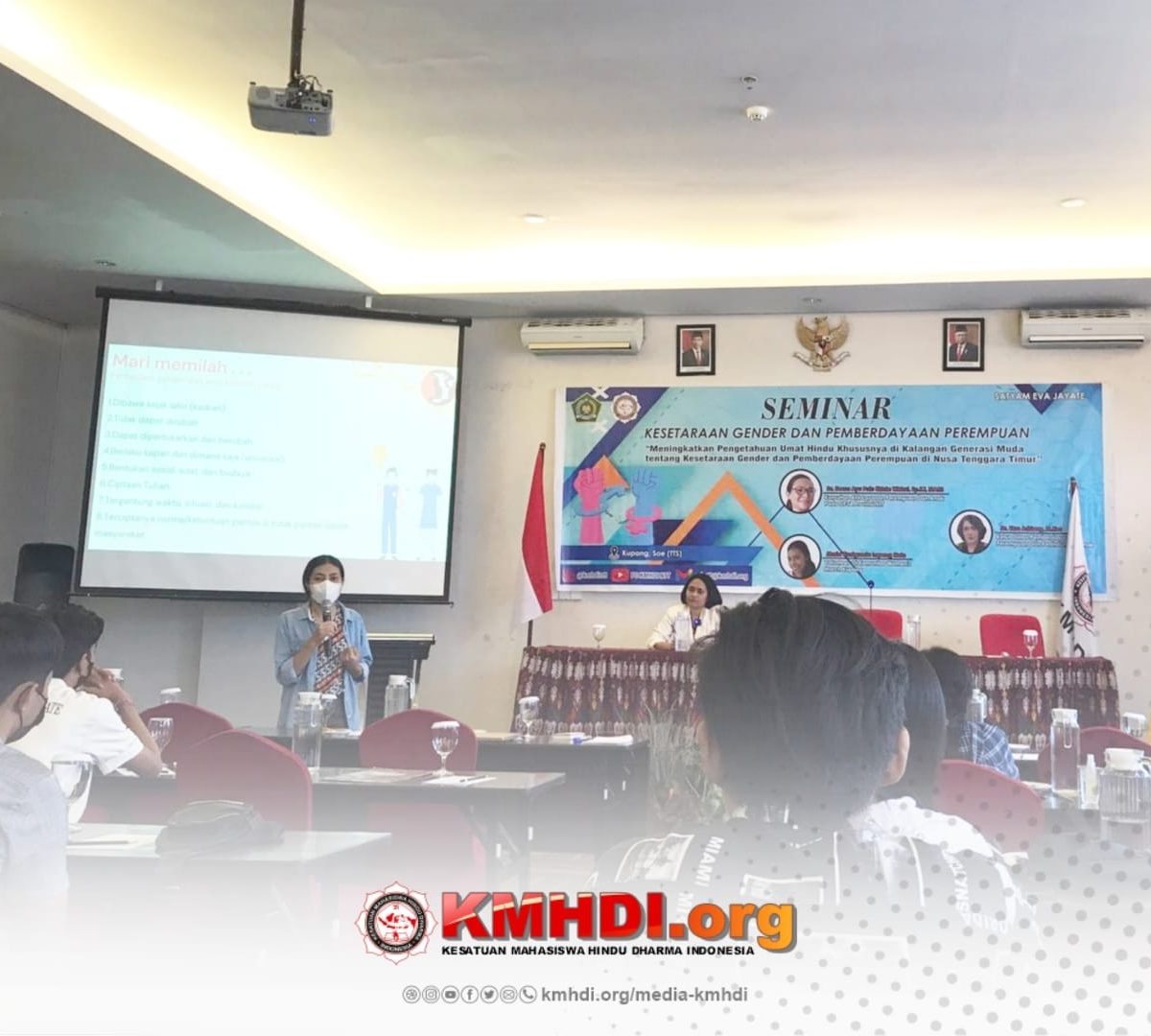 NTT-Pimpinan Daerah Kesatuan Mahasiswa Hindu Dharma Nusa Tenggara Timur (PD KMHDI NTT) menggelar seminar Kesetaraan Gender dan Pemberdayaan Perempuan dengan mengusung tema “Meningkatkan Pengetahuan Umat Hindu Khususnya di Kalangan Generasi Muda tentang Kesetaraan Gender dan Pemberdayaan Perempuan di Nusa Tenggara Timur”. Kegiatan ini dilaksanakan di Neo Aston Kupang pada Minggu (7/8/2022).